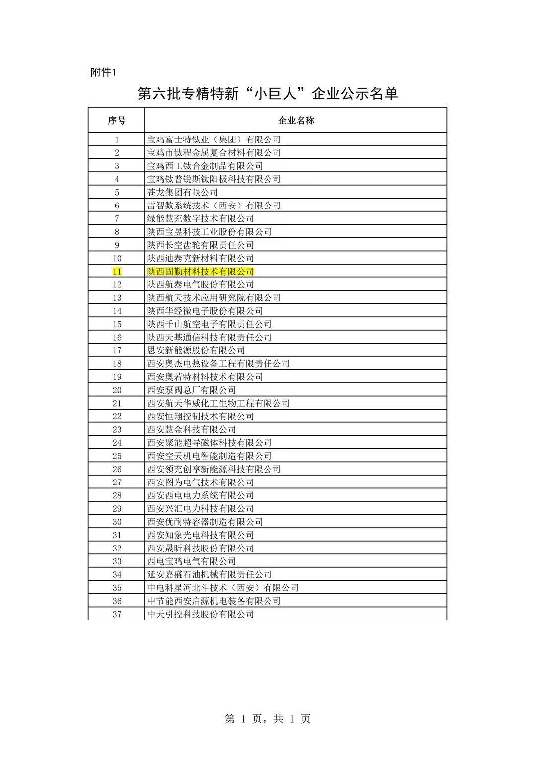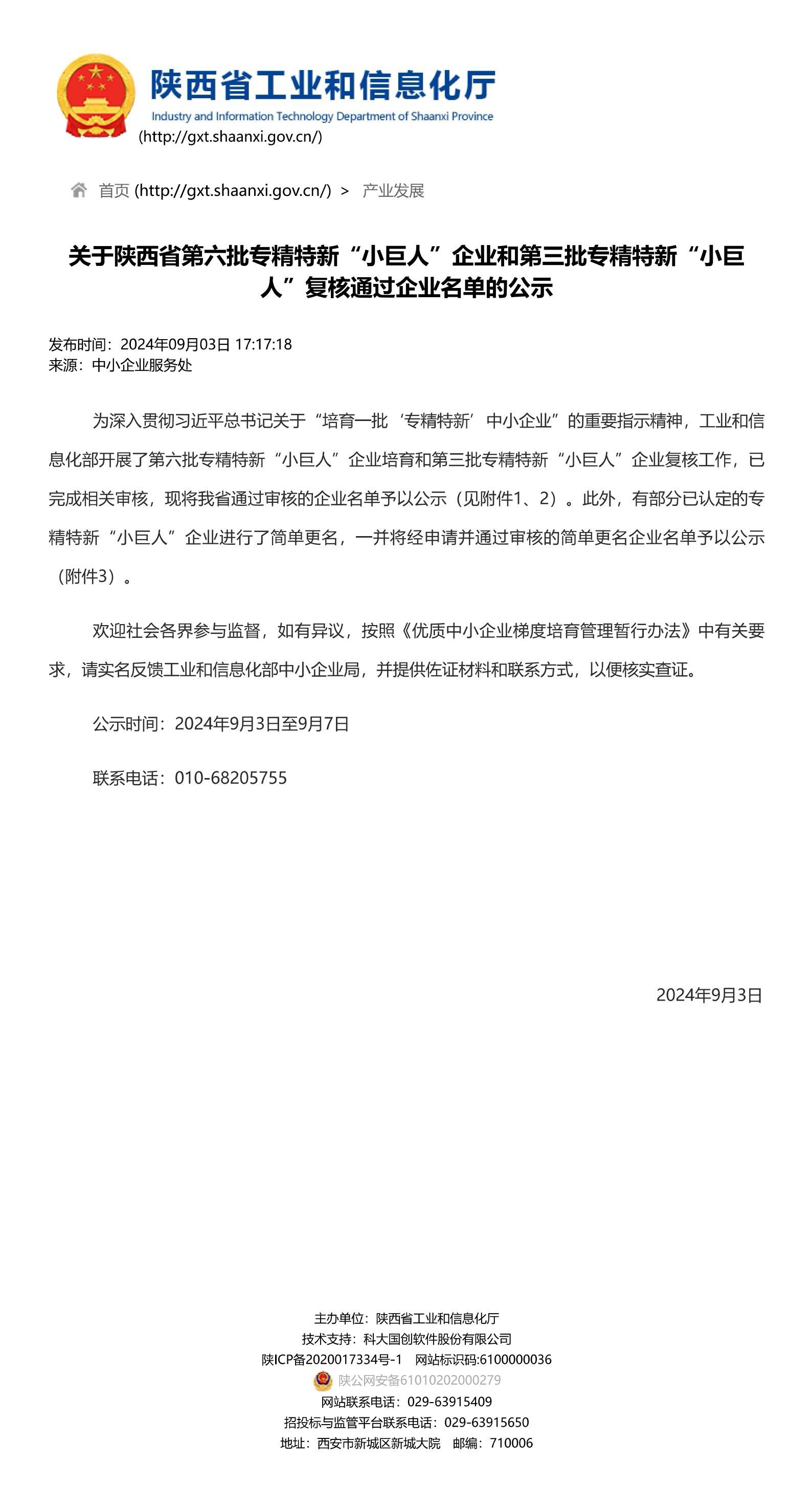 近日,陜西工業(yè)和信息化廳公布了2024年專精特新“小巨人”企業(yè)公示名單,經(jīng)嚴格篩選和綜合評比,陜西固勤材料技術(shù)有限公司成功入選,并榮獲了*級專精特新“小巨人”企業(yè)榮譽稱號。